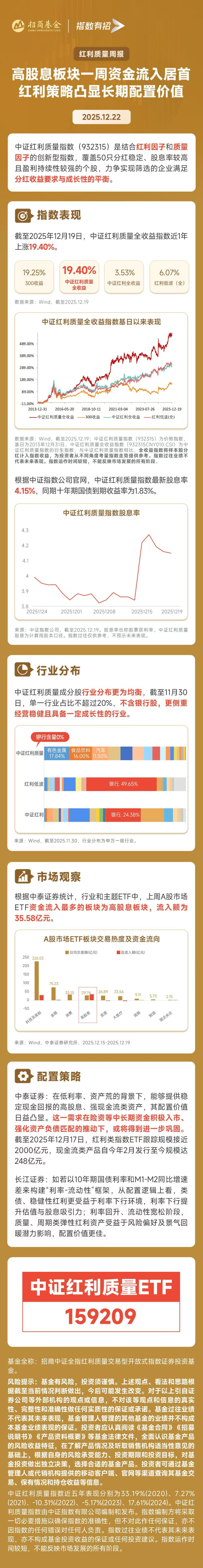 场内热门ETF方面,截至12月22日,中证红利质量ETF(159209)连续6个交易日获资金净流入0.67亿元,最新规模6.1亿元。其跟踪的中证红利质量全收益指数自基日以来年化涨幅17.89%(Wind,2013.12.31-2025.12.22)。